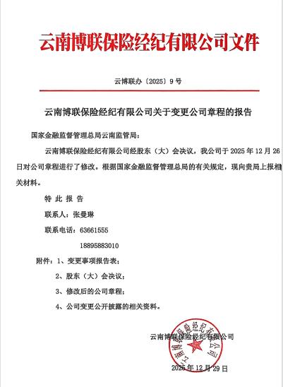 云南博联保险经纪有限公司关于变更公司章程的报告